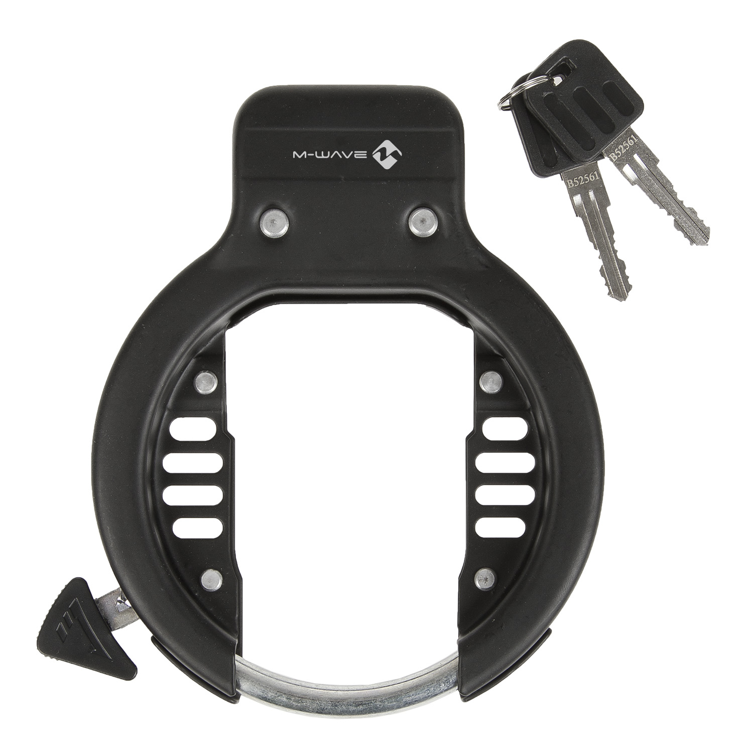 Antifurt de tip potcoavă, cu diametru interior de 64 mm, conceput pentru montare pe cadru. Se fixează solid în 2 șuruburi, fiind prevăzut cu distanțier detașabil pentru blocarea eficientă a roții spate. Pachetul include 2 chei pentru utilizare comodă și sigură.