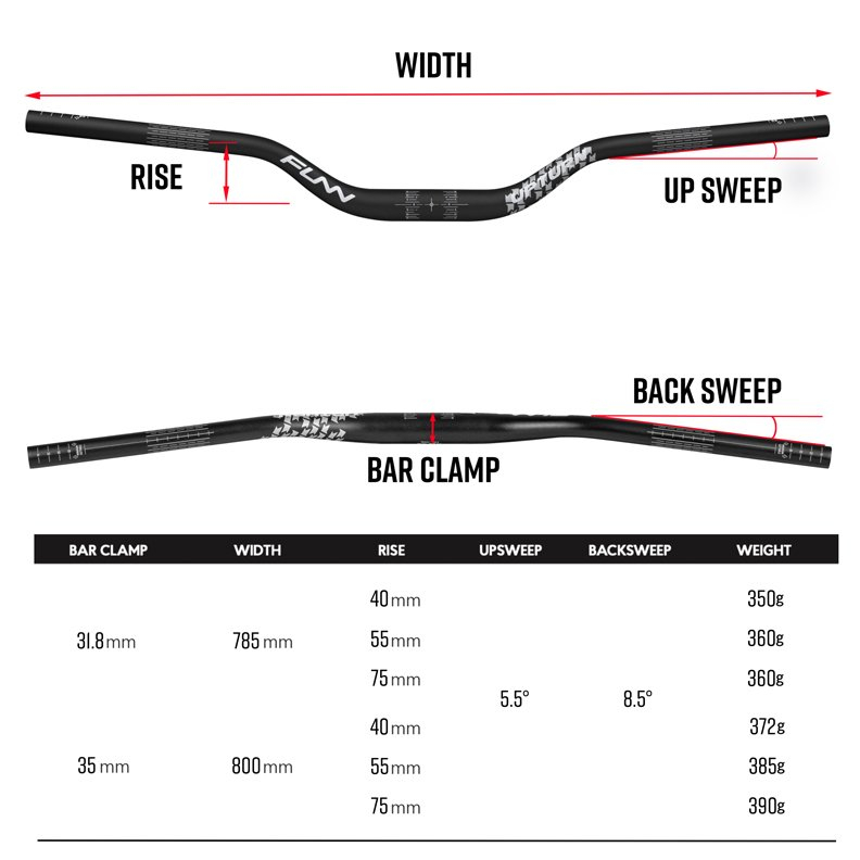 Ghidonul Funn Upturn este realizat din aluminiu 6061, având un diametru de prindere de 31,8 mm și o lungime de 785 mm. Prezintă o ridicare de 55 mm, backsweep de 8.5° și upsweep de 5,5°, oferind un control excelent și confort sporit în timpul deplasărilor off-road. Geometria sa unică este ideală pentru cicliștii care preferă o poziție ridicată în șa, ce asigură o vizibilitate mai bună și manevrabilitate mai ușoară pe teren tehnic.